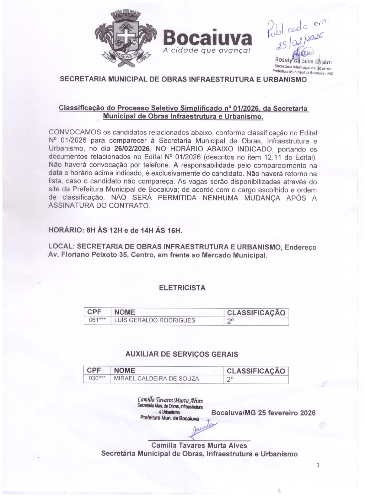 | Súmula: | EDITAL N° 01/2026. Secretaria de Obras |